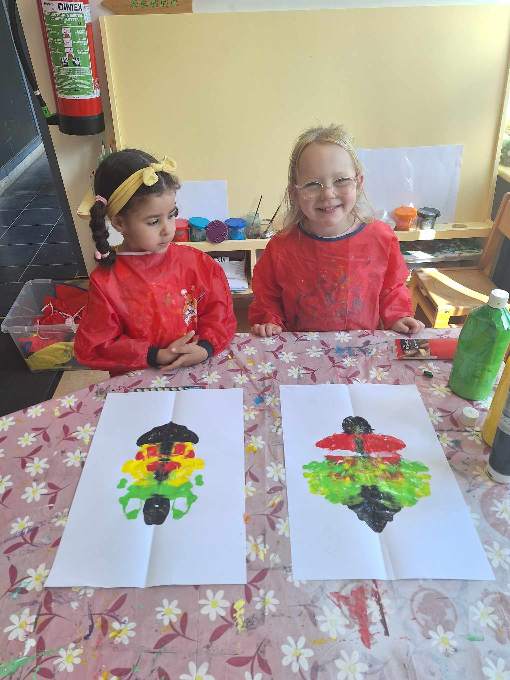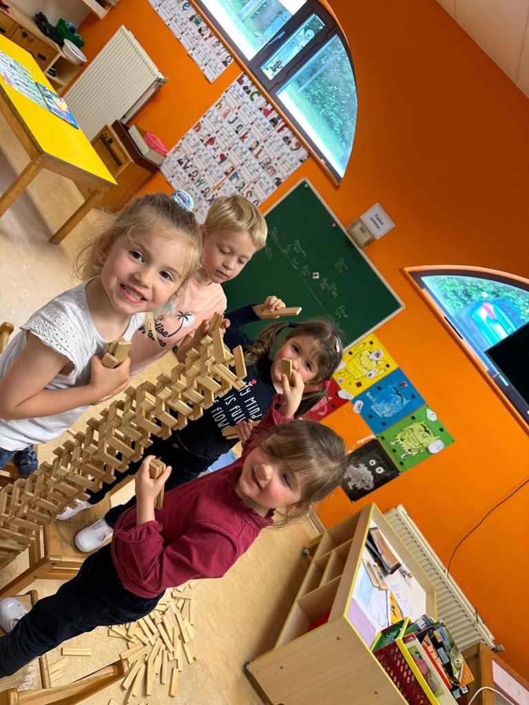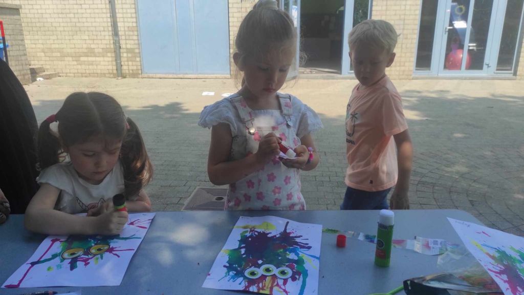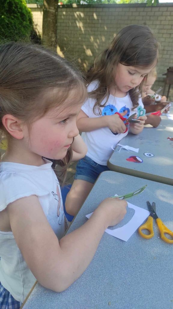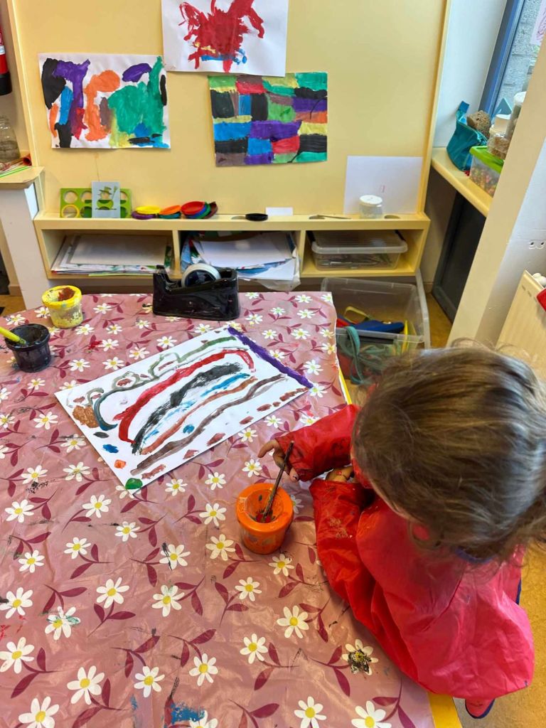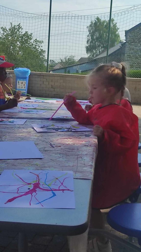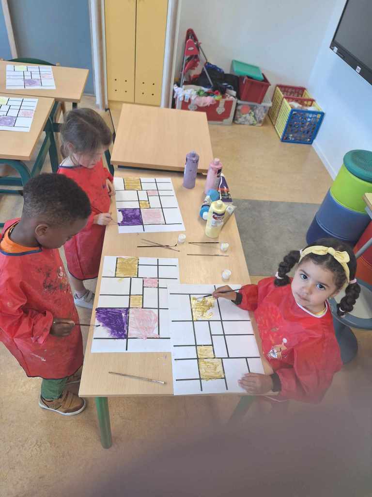 En lien avec différents projets, les enfants travaillent l’artistique. Ils découvrent des peintres et les imitent en apprenant diverses techniques artistiques (ici : Mondrian, en soufflant, en pliant,…).