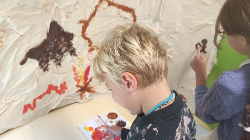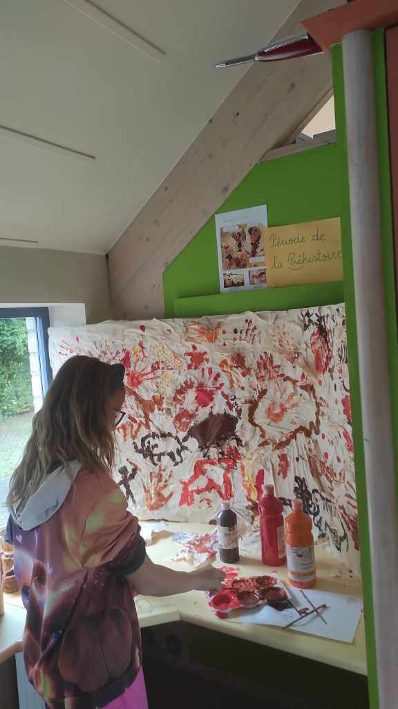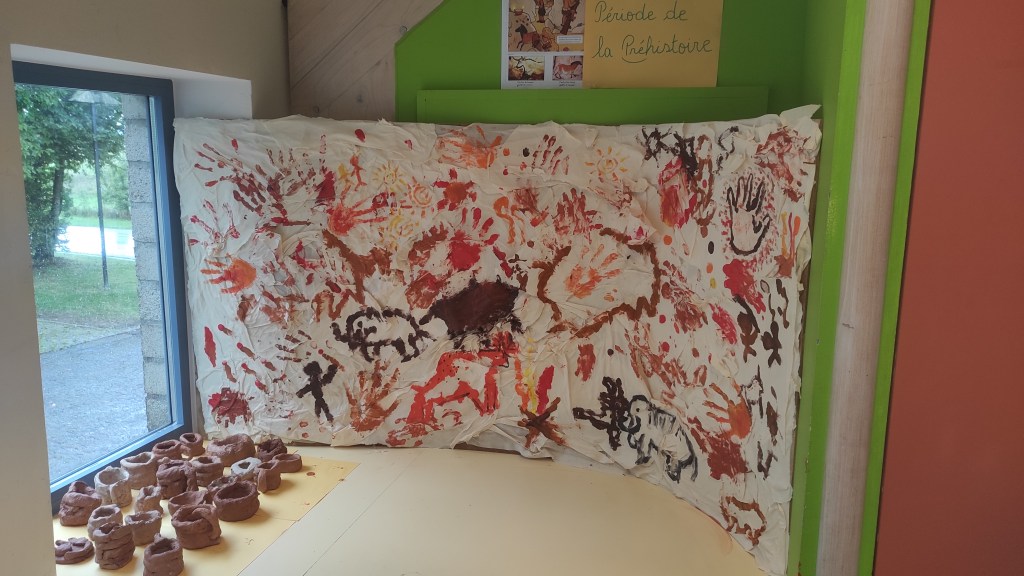 Nous avons ensuite observé chaque caractéristique des peintures rupestres ainsi que les différentes méthodes utilisées pour les réaliser. Après la théorie, nous nous sommes mis au boulot : création d’une paroi de grotte (en papier mâché), peintures rupestres et poteries réalisées comme au néolithique.! 🎨🖌️