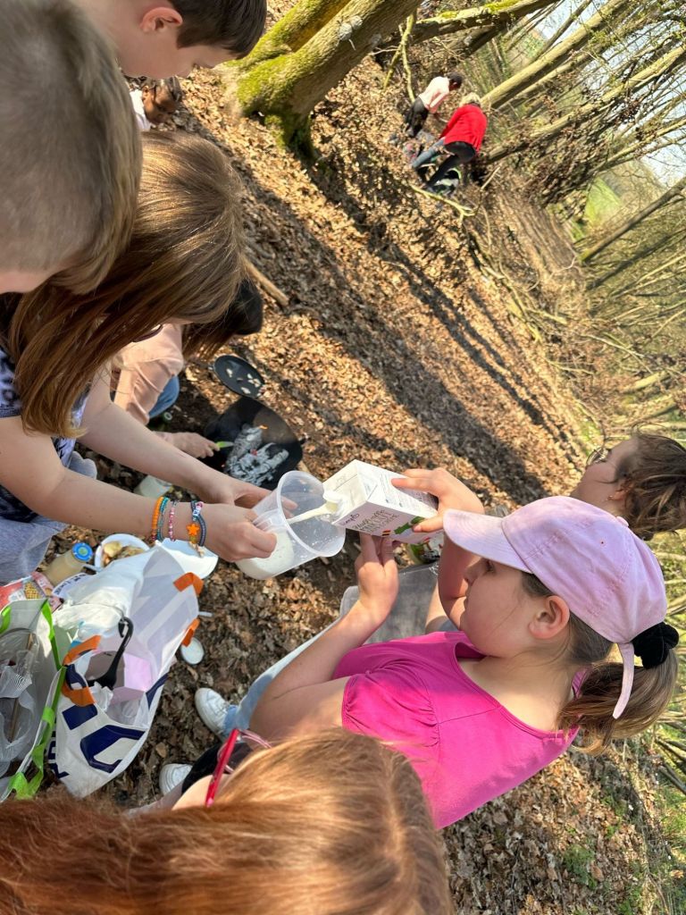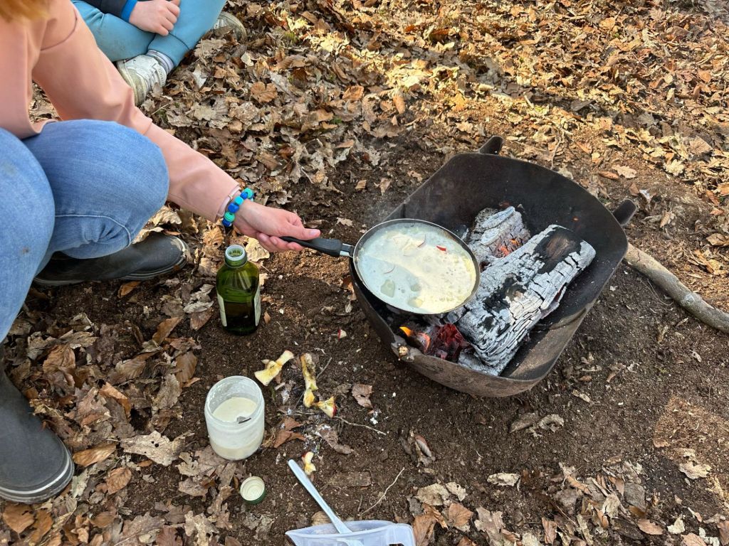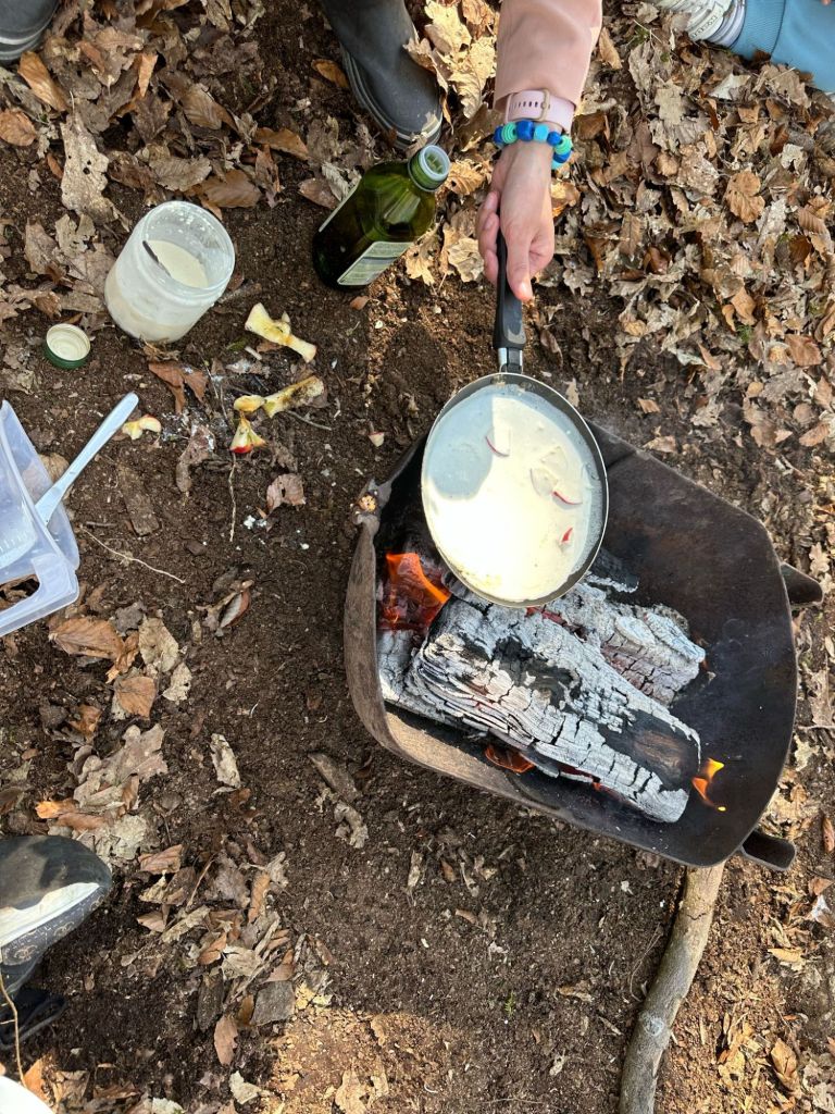 ☀️ Cuisine de la forêt : crêpes aux pommes avec et sans œufs. Mesure des différentes grandeurs et mélange des ingrédients grâce à ce qui est à notre disposition 😊 miam 😋