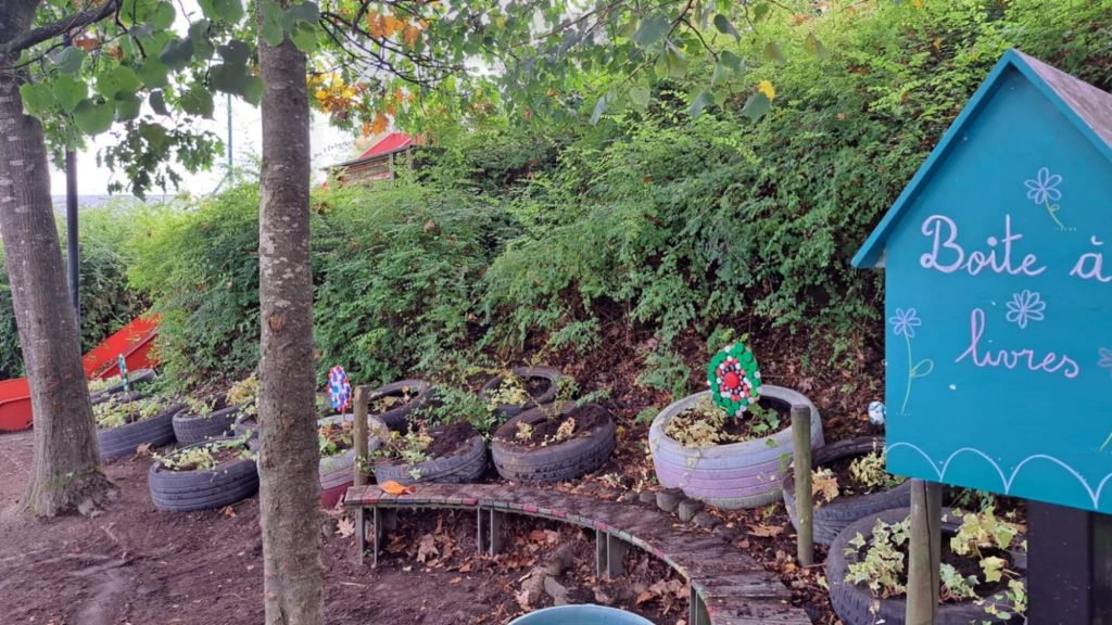 En utilisant des matĂ©riaux de rĂ©cupĂ©ration (pneus, palettes, bouchons, cartons,…), les enfants ont plantĂ© des lierres đ± et créé des fleurs đ” colorĂ©es.