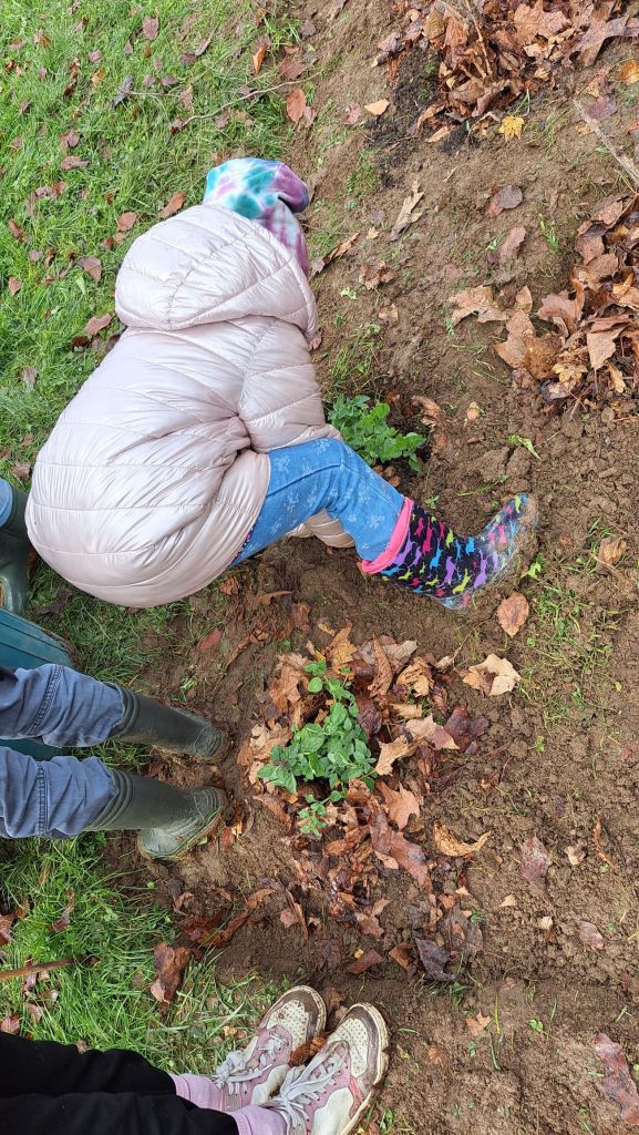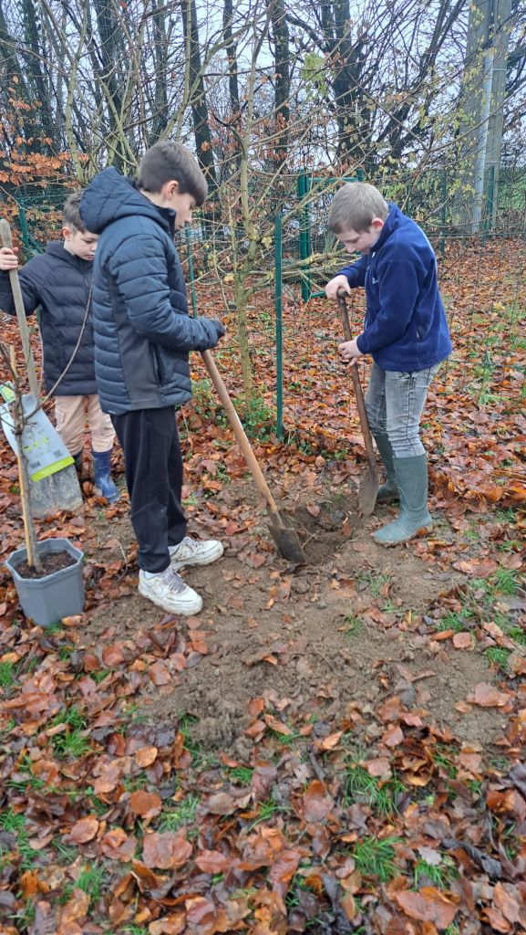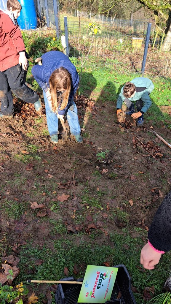 Quelques jours plus tard, GoodPlanet.be nous a livré les arbres, arbustes, plants et graines pour notre plus grand bonheur🤩. Ce n’était pas le jour pour mettre un pantalon blanc, car les enfants avaient de la terre jusqu’au dessus de la tête 😅🤪!